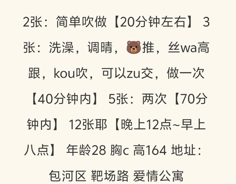 是个老熟人了,突然联系不上,后面还是通过发短信才联系上。人长的漂亮身材又性感,御姐范十足!服务非常到位,我很享受她的服务过程。床上也很配合,能吸会夹。而且也不催客,做完不赶时间都会聊一会。家里偶尔会有小姐妹,可以双飞。