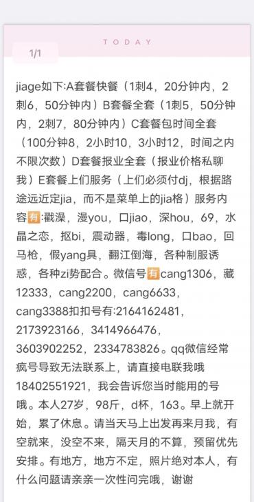 我是qq加的,是别人推荐的,了解价格和看到照片果断前往,坐地铁挺方便的,到了先给你洗澡,帮你洗,这点挺好的,现在好多都让自己洗,然后先背面,胸推,吸背,服务时间不长,然后口,我是口爆一次做一次,妹子口活确实厉害,嘴包裹jj舌头里面转圈,一会就抱头猛插射了,洗之后妹子简单按了一下背,就是不太认真,边玩手机边岸,也不怎么聊天,然后第二次pp,总体感觉还不错,听话也耐艹